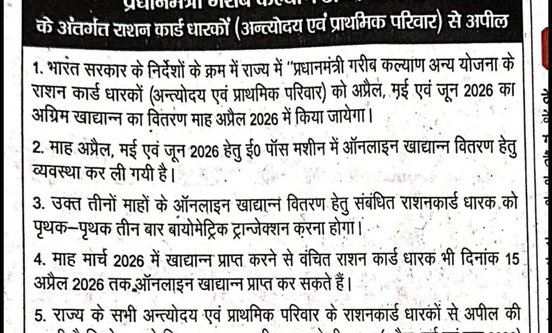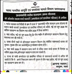 भारत सरकार के निर्देशों के क्रम में *प्रधानमंत्री ग़रीब कल्याण अन्न योजना* के राशन कार्ड धारकों (अन्त्योदय एवं प्राथमिक परिवारों ) को अप्रैल-मई-जून माह का अग्रिम खाद्यान वितरण इसी महीने अर्थात् अप्रैल माह में किया जाएगा।
